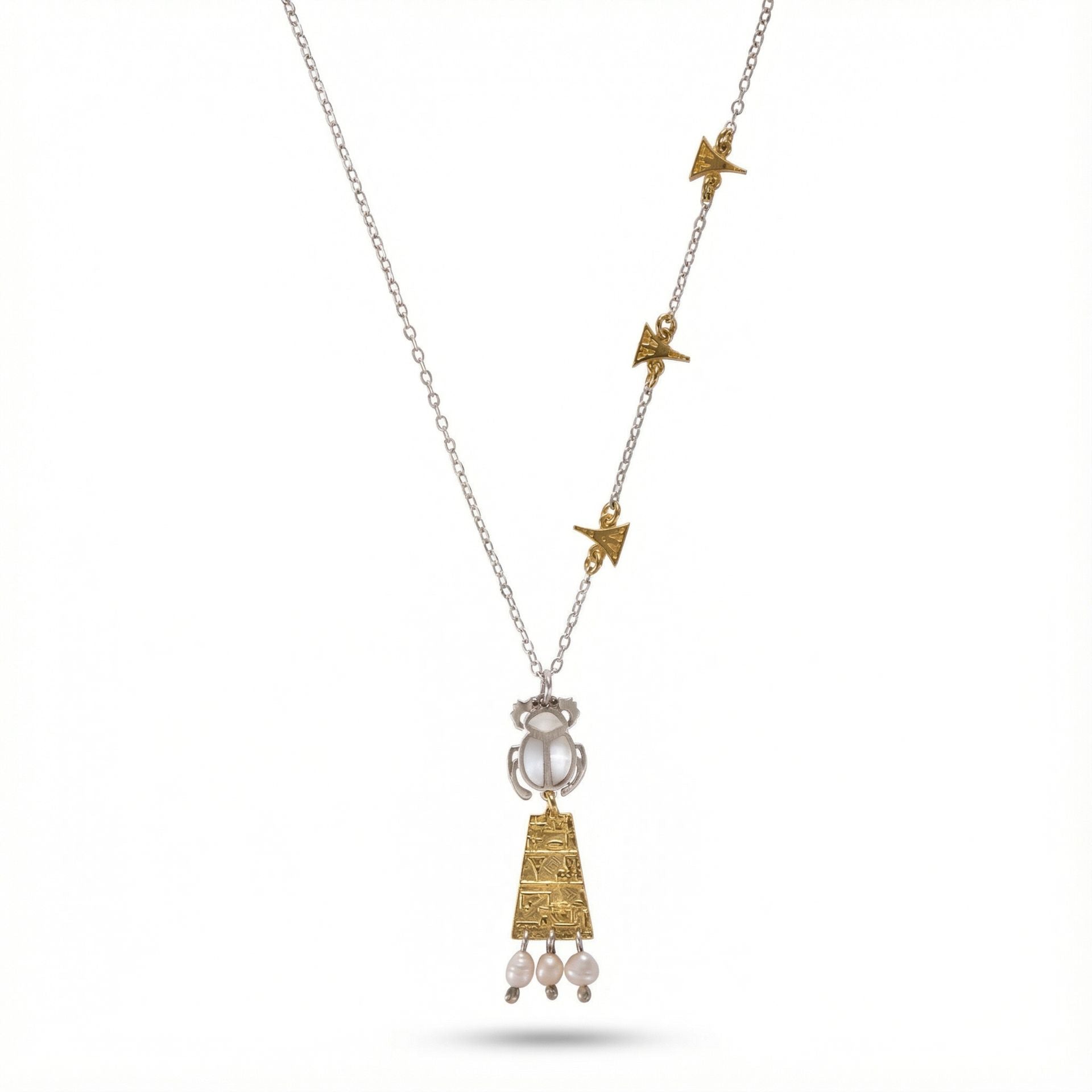 A pendant necklace crafted with freshwater pearls, mother-of-pearl, and two golden panels with hieroglyph lettersframing a scarab. Pearl drops trace the line of the clavicle, merging heritage with elegance.